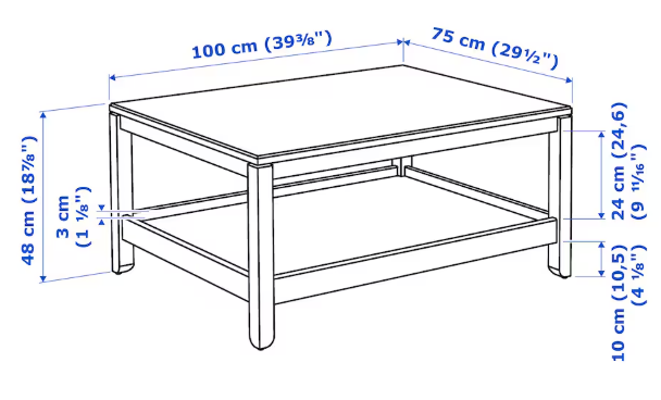 Een simpele zwarte salontafel met een extra plank onder het blad zodat je meer ruimte hebt om dingen op te bergen.